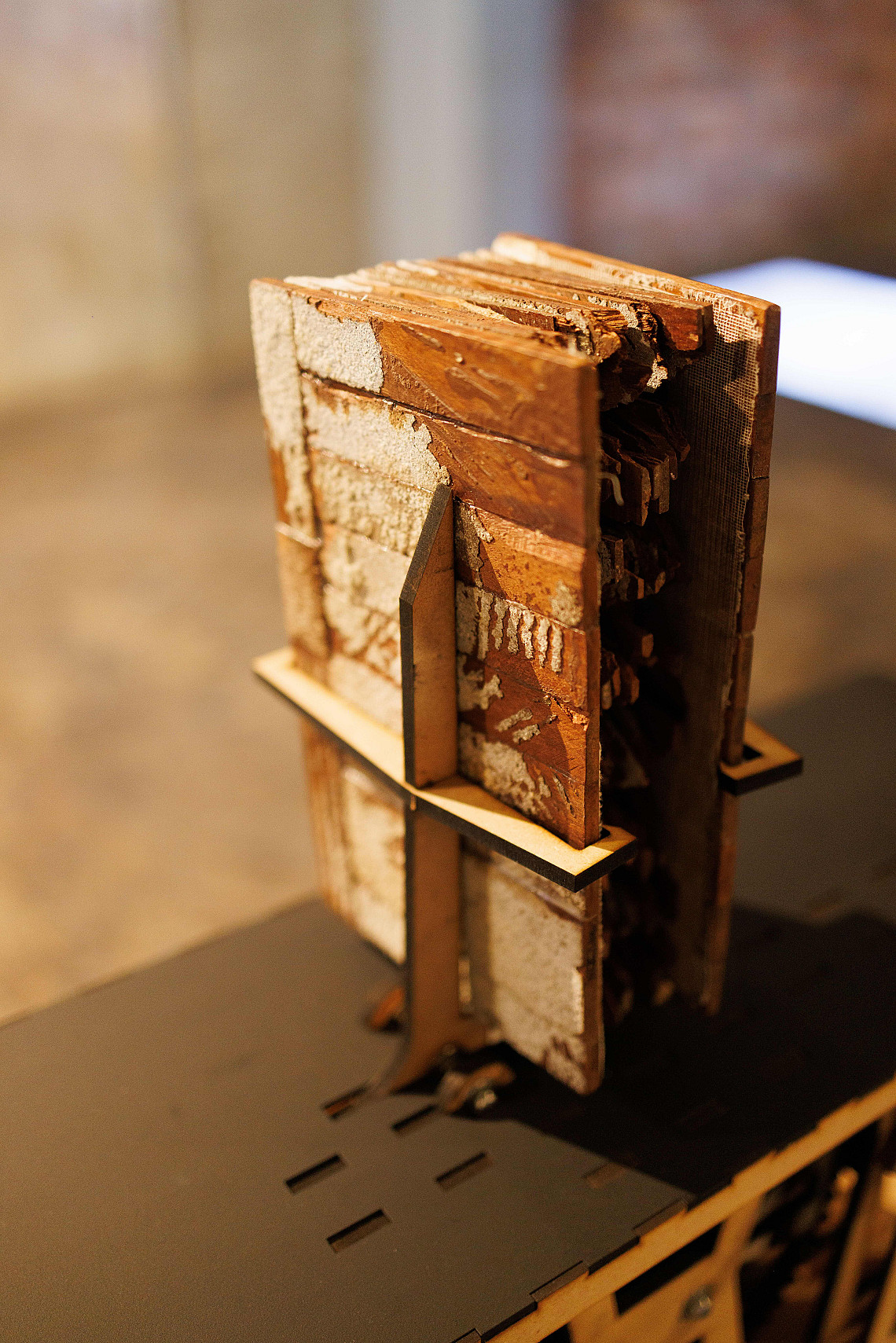 The artist’s book on this mechanised stand is constructed from discarded parquet floor blocks sourced from the gentrified neighbourhood Woodstock in Cape Town. Marks of residue visible on the wooden blocks are significant reminders and verified documents of the previous installed floors. The act of opening and closing this book evokes the action and sound when wooden floors are ripped out of their roots when homes are demolished.