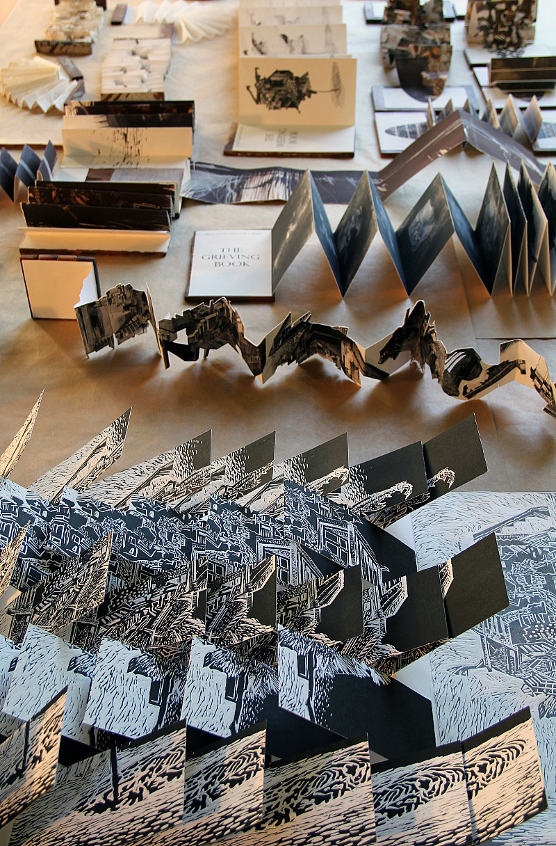 Discarded parquet floor blocks, mixed media on paper, scrim