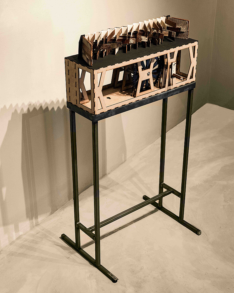 Artist's book made from discarded parquet floor blocks, paper and scrim; mechanised stand made from steel, wood and plastic