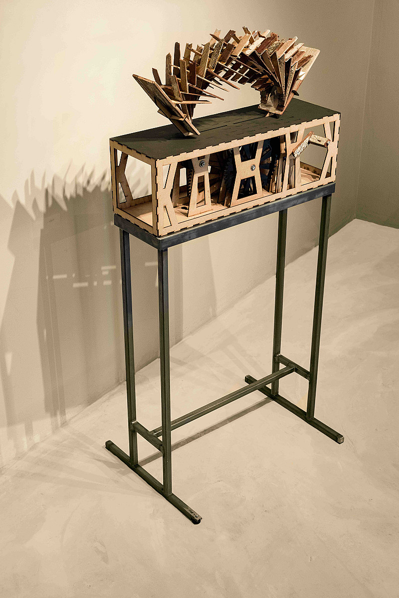 Floor uprooting device I and II, Emma Willemse , Artist's book made from discarded parquet floor blocks, paper and scrim; mechanised stand made from steel, wood and plastic