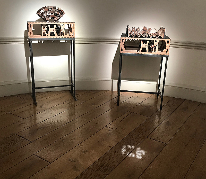 Floor uprooting device III and IV, Emma Willemse , Artist's book made from discarded parquet floor blocks, paper and scrim; mechanised stand made from steel, wood and plastic