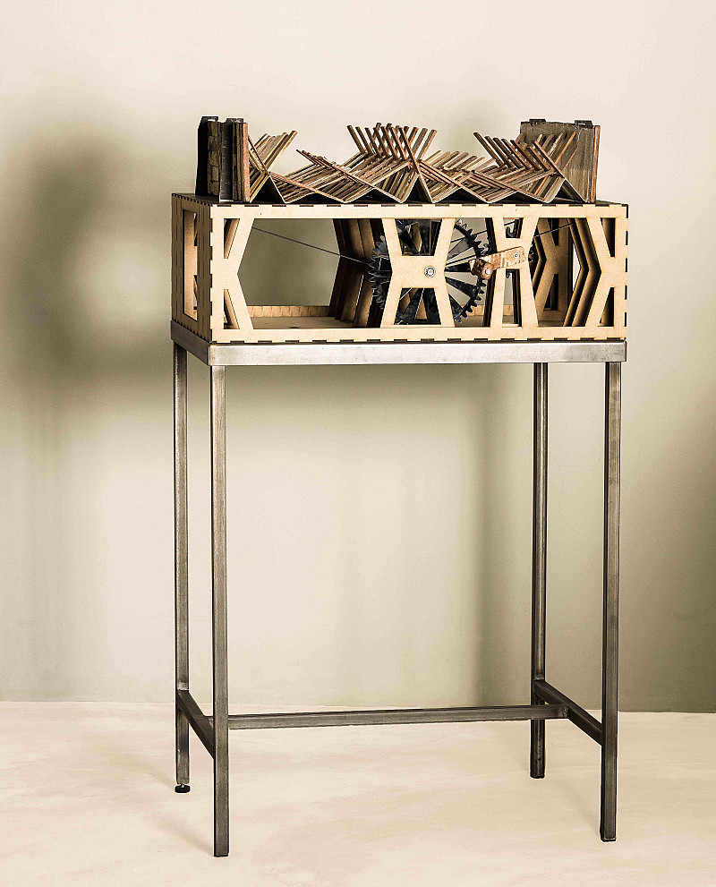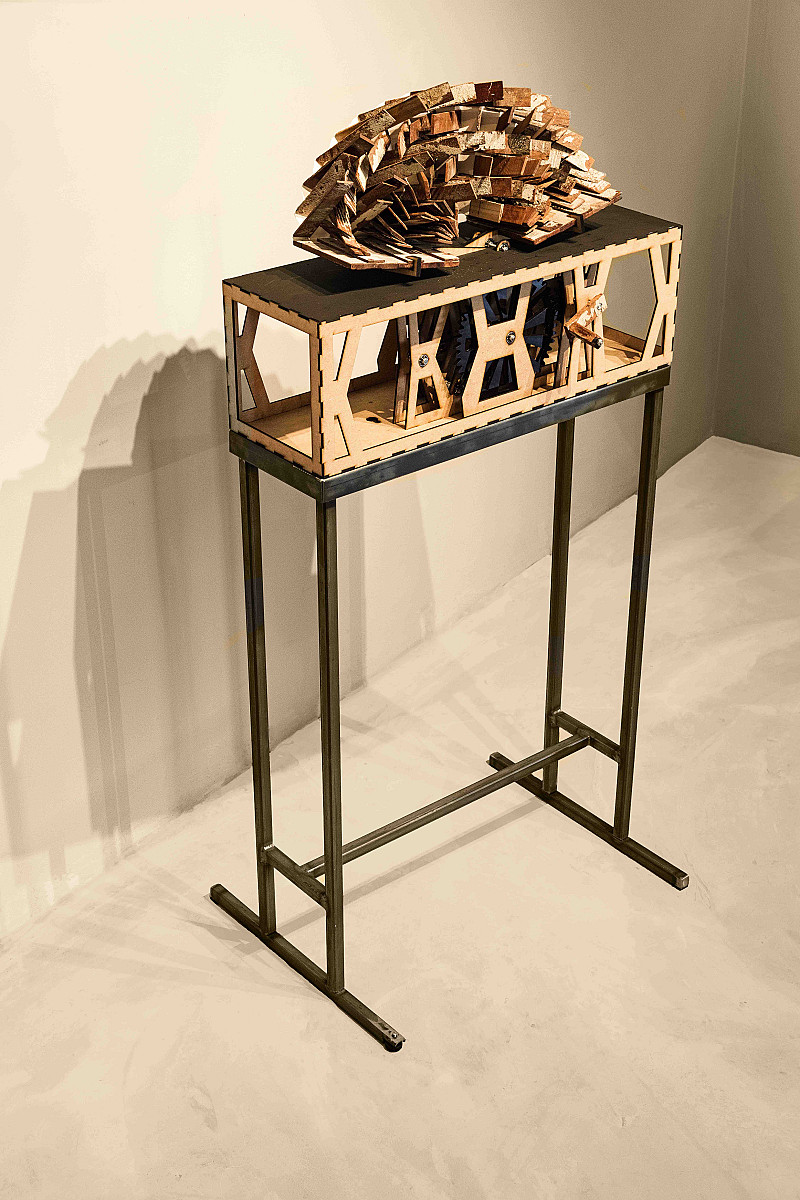 Artist's book made from discarded parquet floor blocks, paper and scrim; mechanised stand made from steel, wood and plastic