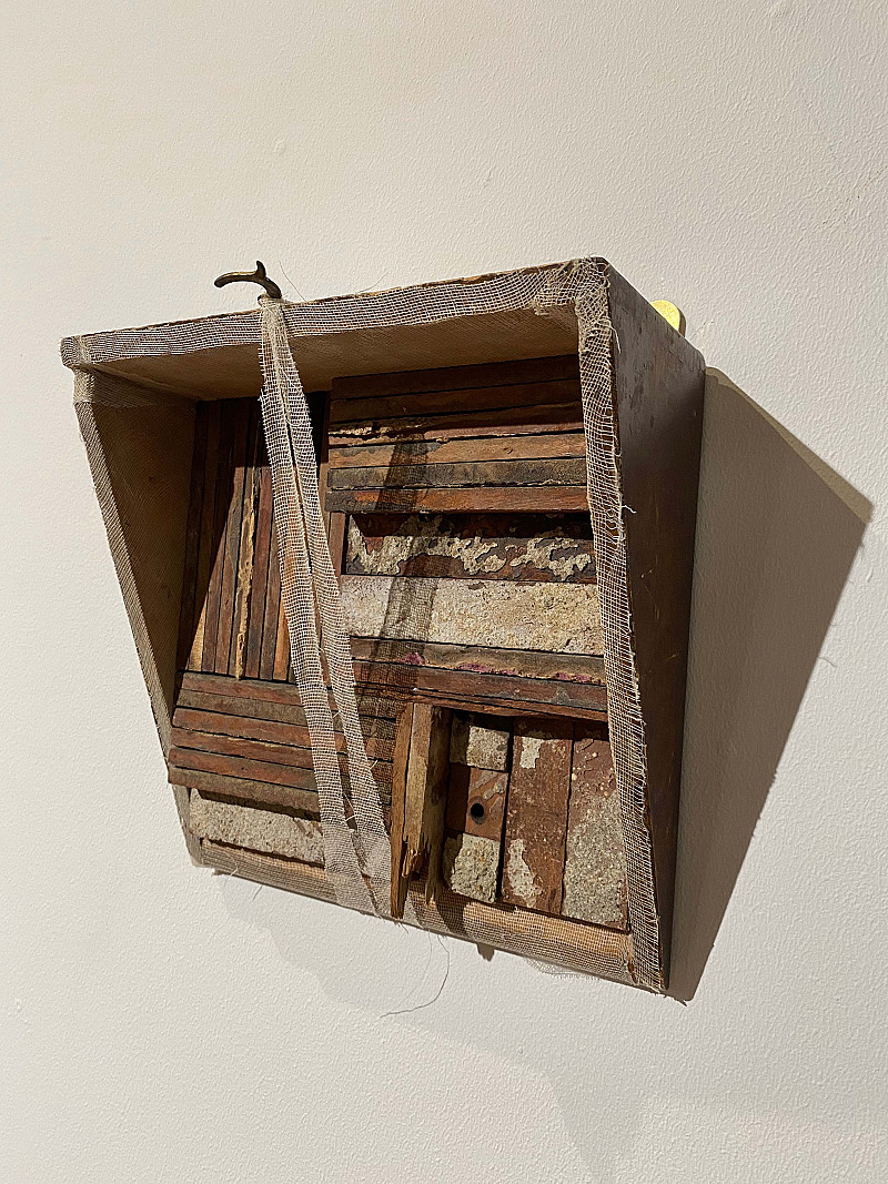 Discarded parquet floor blocks, found wooden shelf, scrim