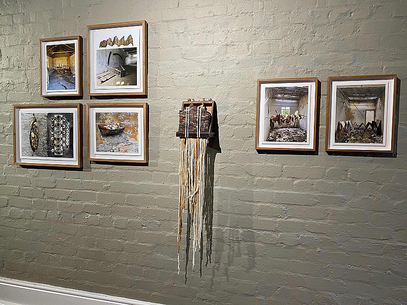 Digital prints and a wall sculpture called 'Spilling archive' arranged in a wall installation, Union House Cape Town.
